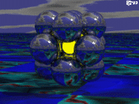 | This animation shows how powerful raytracers are at rendering images. Look at how the crystal spheres refract and magnify the surfaces as they submerge beneath the floor. | ![]() |